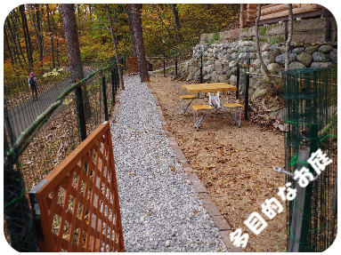 入口からミニログキャビンまでは砂利ひきの通路になっています。